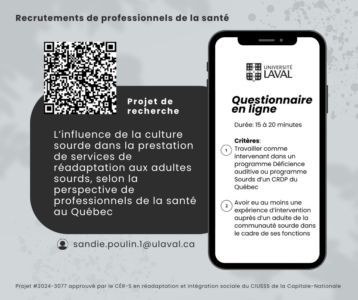 Nous sommes à la recherche de participants pour compléter un questionnaire en ligne, d’une durée de 15 à 20 minutes, afin de décrire la compétence culturelle des intervenants des programmes de réadaptation destinés aux adultes Sourds de la province de Québec.