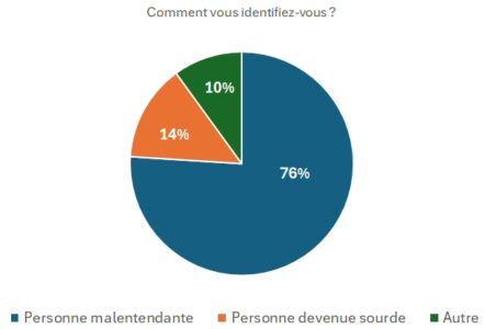 76 % des répondants au sondage s’identifient comme personnes malentendantes, 14 % comme personnes devenues sourdes, et 10 % sont des professionnels de l’audition et des proches de personnes malentendantes.